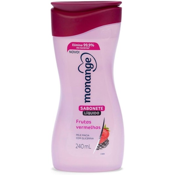 SABONETE LÍQUIDO MONANGE FRUTAS VERMELHAS 240ML, PELE MACIA COM GLICERINA, ELIMINA 99,9% DAS BACTÉRIAS