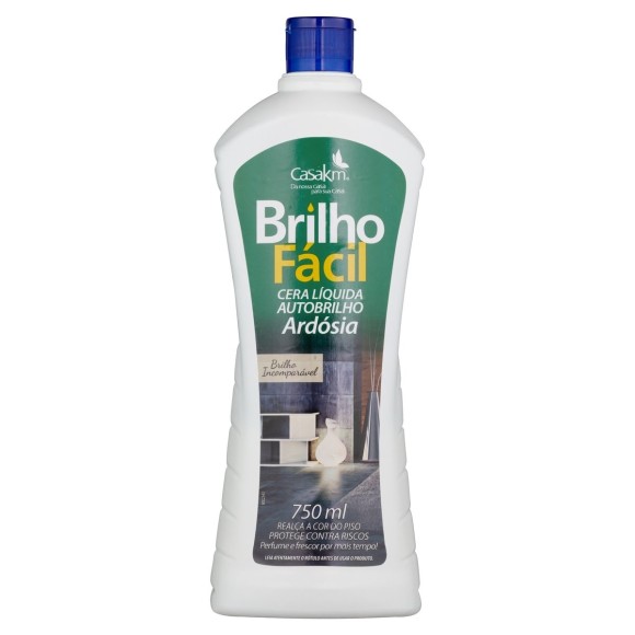 Brilho Fácil Ardósia 750ml é uma cera liquida auto brilho que realça a cor do piso, protege contra riscos, perfume e frescor por mais tempo, com um brilho incomparável. Indicado para ardósia, cerâmicas, lajotas, ladrilhos, paviflex, pisos de madeira com sinteco ou cascolac.