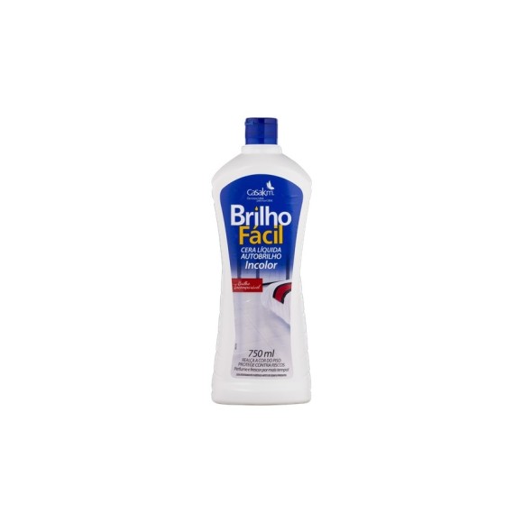 Brilho Fácil Incolor 750ml é uma cera liquida auto brilho, incolor, que realça a cor do piso, protege contra riscos, perfume e frescor por mais tempo, com um brilho incomparável. Indicado para cerâmicas, lajotas, ladrilhos, paviflex, pisos de madeira com sinteco ou cascolac.