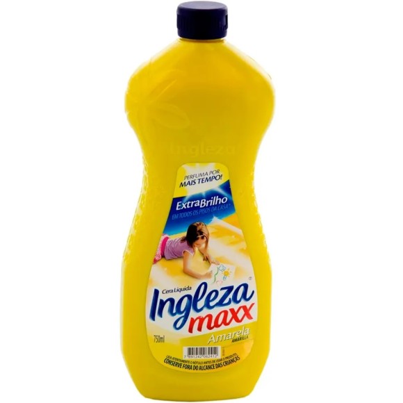 Cera liquida Ingleza Maxx Amarela 750ml, indicada para pisos laváveis, Sintecados, Vinílicos e Similares. Proporciona Brilho intenso e proteção Prolongada.