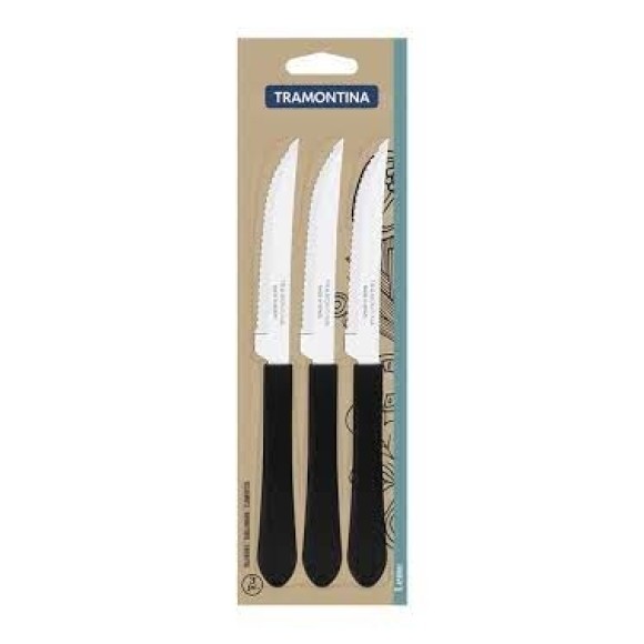 FACA DE MESA COM LÂMINAS DE AÇO INOX E CABOS DE POLIPROPILENO TRAMONTINA COM 3 UNIDADES , NA COR PRETO.