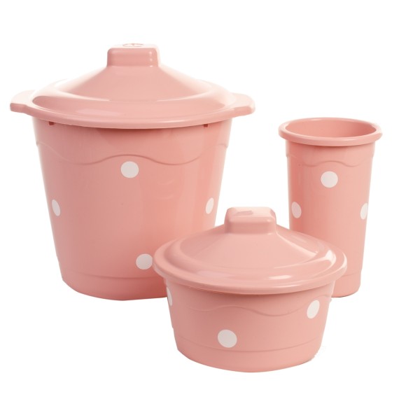 Kit para pia com estampa de bolinhas. O kit possui compartimento para bucha, detergente e balde para lixo.