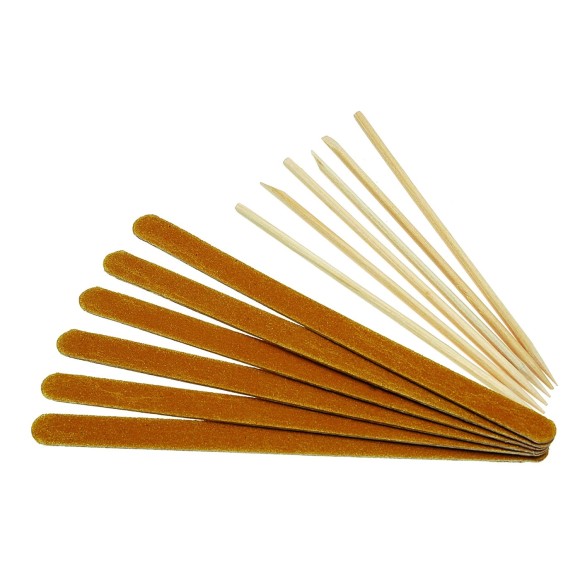 Kit de unha. Contém 6 lixas de unha e 6 palitos.