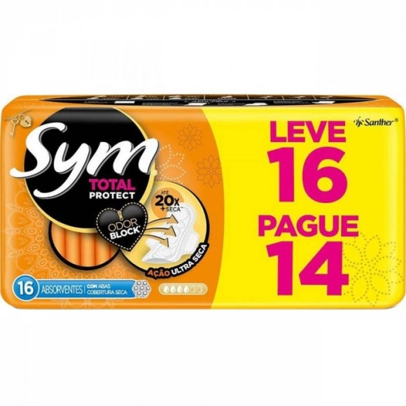 Pacote de absorvente Sym Total Protect Odor Block com abas cobertura seca. 16 unidades
